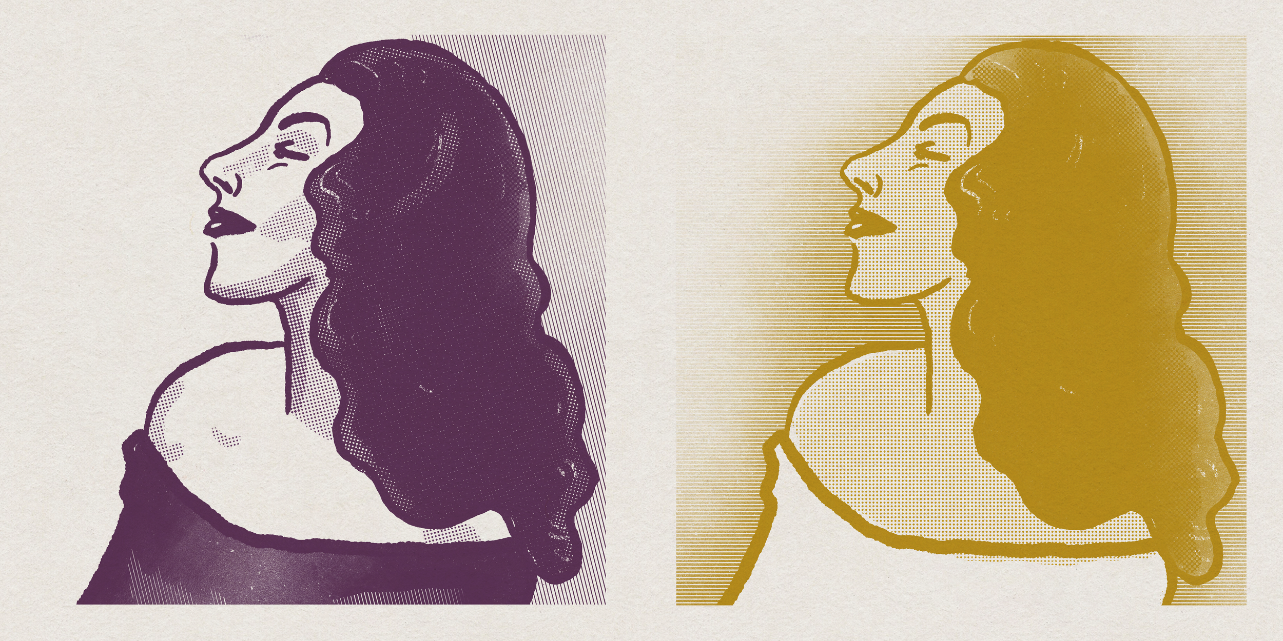 The illustration is a digital print using a two-colour palette of purple and gold. Using a limited colour palette gives the piece a timeless character, while also evoking the tactile, print-like quality of traditional screen printing.